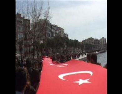 “Mustafa Kemal’in askerleriyiz”, “Şehitler ölmez, vatan bölünmez” sloganlarıyla iskeleye kadar yürüyen vatandaşlar saygı duruşunda bulundu. İstiklal Marşının okunmasının ardından yürüyüş sona erdi.
