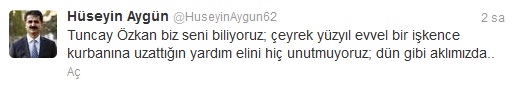 Gazeteci Tuncay Özkan için istenen cezayı eleştiren CHP Tunceli milletvekili Hüseyin Aygün ise AK Parti Gaziantep Milletvekili Şamil Tayyar 'ın hedefi oldu. Özkan için istenen cezayı twitter adresinden eleştiren CHP 'li Aygün, ' 'Tuncay Özkan biz seni biliyoruz; çeyrek yüzyıl evvel bir işkence kurbanına uzattığın yardım elini hiç unutmuyoruz; dün gibi aklımızda ' ' ifadelerini kullandı.