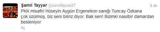Aygün 'ün bu çıkışına tepki gösteren AK Parti 'li Tayyar ise PKK misafiri Hüseyin Aygün Ergenekon sanığı Tuncay Özkana çok üzülmüş, biz seni biliriz diyor. Bak sen! Bizimki nasıl bir damardan besleniyor ' ' diye yazdı.