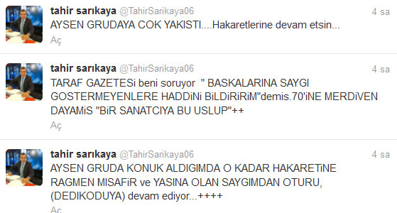 Ayşen Gruda 'nın bu sözlerine ise Tahir Sarıkaya 'dan yanıt gecikmedi. Sosyal paylaşım sitesi Twitter 'daki sayfasından yanı veren Tahir Sarıkaya ise Gruda için şu twitleri paylaştı: