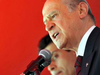 Milletin, duvarları kana bulanmış ''ikna salonları''na alınarak PKK'ya kurban verilmesinin, hiçbir şart altında mümkün ve ihtimal dahilinde olmadığına dikkati çeken Bahçeli, ''Başbakan Erdoğan ve İmralı canisinin birlikte yapamadıklarını, yedeklerine aldıkları 63 kişinin başarması ve bununla birlikte aziz milletimizin bölünmeye inandırılması imkansızdır. Bölücülüğün çirkin oyunları, hükümetin çirkef komploları, emperyalizmin melanet tuzakları Türk milleti tarafında bozulacak ve Allah'ın izniyle muhataplarının başında paralanacaktır'' ifadesini kullandı.