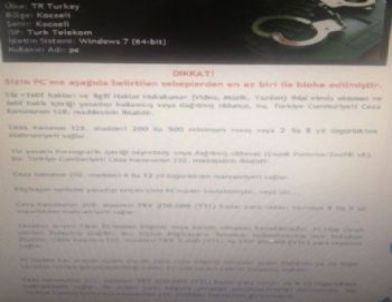Bilgisayara özel olarak atılan bir virüs sayesinde bilgisayarı kullanım dışı bırakan dolandırıcılar, Emniyet Genel Müdürlüğü'nün, Uluslararası Siber Güvenlik Koruma İttifakı (ICSPA) ve Uluslararası Polis Teşkilatı’nın da (İnterpol) konudan bilgisi olduğunu aktarıyor. Bilgisayarınızın IP numarasının altında yaşadığınız şehir yazıyor, PC kamerası aktif hale geliyor ve polisin kimliğinizi tespit etmek için çalışma başlattığı belirtiliyor.Bilgisayarın bloke edildiğini aktaran sözde uyarı yazısında şu ifadeler yer alıyor: “IP numaranız xxxx’dır. Bilgisayarınız kilitlendi; Sizin PC'niz aşağıdaki belirtilen nedenlerden en az biri nedeni ile bloke edilmiştir, aşağıda tarafınızdan yapılan olası ihlaller listelenmektedir; Telif hakları kanunun (video müzik yazılım) ihlal etmiş oldunuz ve telif haklı içeriği yasa dışı kullanmış veya dağıtmış oldunuz. Bu Türkiye Cumhuriyeti Ceza Kanununun 128. maddesinin ihlali demektir. Ceza Kanununun 128. maddesi 200 ile 500 maksimum maaş veya 2 ile 8 yıl arası özgürlükten men sağlar. Siz yasaklı pornografik içeriği seyretmiş veya dağıtmış oldunuz.