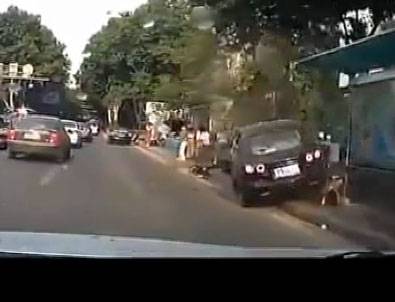 Çin'in Nanjing şehrinde bir otomobil, düz yolda giderken otobüs durağına daldı.