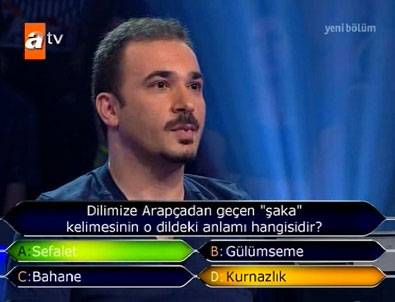 Kesal 250 bin TL'lik soruda karşısına gelen "Dilimize Arapçadan geçen "şaka" kelimesinin o dildeki anlamı nedir?" sorusuna "Kurnazlık" dedi. Sorunun yanıtı "Sefalet" çıkınca "Bu da bana şaka oldu" dedi.