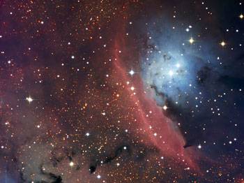 Buluttan meydana gelen bu parlak sıcak genç yıldızlar, hala çevrelerinde bulunan bulutsudaki hidrojen gazına enerji sağlıyor. Gaz bu enerjiyi tekrar dışarıya atarak görüntünün merkezine yakın yerde iplik şeklindeki kırmızı bulutu meydana getiriyor. Bu nesne, salma bulutsusu olarak da biliniyor.