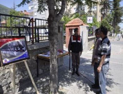 İlçe Jandarma Bölük Komutanlığı önünde açılan sergide, yıl içerisinde yapılan faaliyetler ve trafik kazaları ile ilgili fotoğraflar sergileniyor. Açılan sergi yoldan geçen vatandaşların dikkatini çekerken, görevli trafik tim komutanlığı personeli tarafından da vatandaşlar bilgilendirilerek çeşitli hediyeler veriliyor. Sergilenen fotoğrafların üzerinde ‘Emniyet Kemeri yaşamla ölüm arasındaki bağdır’, ‘Karlı havalarda dikkat edin kış lastiklerinizi mutlaka takın’, ‘Trafikle ilgili bilinçli hareket etmek milli bir görevdir’, ‘Trafik kazası doğal bir afet değildir ama en az onun kadar can yakar’, ‘Her trafik kuralı en az bir hayat kadar değerlidir’ gibi çeşitli sloganlarla vatandaşlara trafik konusunda da uyarılarda bulunuluyor.