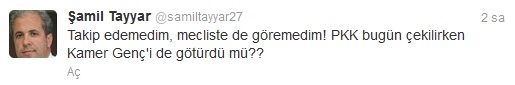 Çekilme kararı alan PKK'dan, CHP Tunceli Milletvekili Kamer Genç'i götürmesini isteyen AK Parti Gaziantep Milletvekili Şamil Tayyar, PKK'nın Genç'i götürüp götürmediğini sordu.