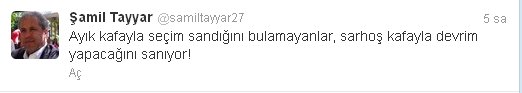 AK Parti Gaziantep Milletvekili Şamil Tayyar, Gezi Parkı olaylarıyla ilgili olarak ''Ayık kafayla seçim sandığını bulamayanlar. Sarhoş kafayla sokaklarda eylem yapıyorlar." dedi.