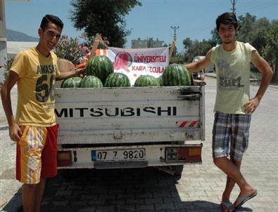 "Üniversiteyi kazanıp mezun olsak bile nasıl olsa karpuz satacağız" diyen lise mezunu iki genç, üniversite öğrencisi olmak için bir yandan lisans yerleştirme sınavlarına(LYS) girerken bir yandan da karpuz standı açtı.
