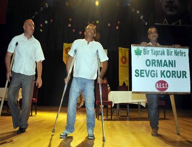 1996 yılında Samsun’da kurulan ve pek çok engelli vatandaşa istihdam sağlayan Engelsiz Yürekler Sanat Eğitim Merkezi oyuncuları, sorunlarını mizahi dilde sahneye taşıyarak engellilerin sesi oldu. ‘Hayat Tek Kullanımlıktır’ oyunuyla izleyenleri büyüleyen oyuncular, “Engelli oluşumuza acımayın. Bize de yer verin dünyanıza” sözleri üzerine izleyenlerden büyük alkış aldı. Akıl hastanesinden kaçan iki engelli delinin engelli hastanesi kurarak vatandaşları tedavi etmeye çalışması üzerine yaşadıkları komik anları anlatan oyun, izleyenlerden tam not aldı. Oyun içinde izleyenlere ‘Yaşarken kimin başına ne geleceği belli olmaz, hayatı dolu dolu yaşamalıyız. Dünyaya nasıl geldiysen yaşamak zorundasın ve bunun için de elinden gelenin en iyisini yapmalısın’ mesajı veren oyuncular, izleyenleri duygulandırdı. Oyun bitiminde ‘Orman sevgi korur. Bir yaprak bir nefes’ pankartı açan oyuncuları seyirciler dakikalarca ayakta alkışladı.