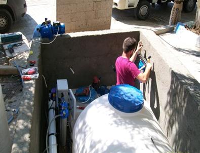 Belde meydanında kurulan arıtma tesisinin 24 saatte 10 ton su arıttığını bildiren Başkan Arif Efetekin, “Komşularımız şebeke suyunu içmekte zorlanıyordu. Bunun için arıtma tesisini kurduk. Komşularımız buradan yararlanmaya başladı.