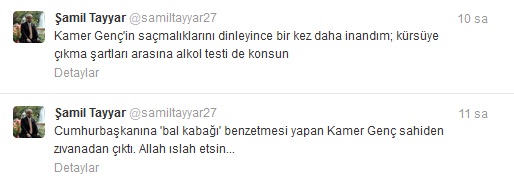 İşte Genç'in hakaret niteliğindeki bu sözleri ardından bir tepki de AK Parti Gaziantep Milletvekili Şamil Tayyar'dan geldi. Sosyal paylaşım sitesi Twitter üzerinden CHP'li Genç'e yüklenen Tayyar, 'Kamer Genç sahiden zıvanadan çıktı. Allah ıslah etsin...' ifadesini kullandı. Attığı bir diğer tweetinde ise Genç'in saçmaladığını savunan Tayyar, 'Kamer Genç'in saçmalıklarını dinleyince bir kez daha inandım; kürsüye çıkma şartları arasına alkol testi de konsun' diye ekledi.
