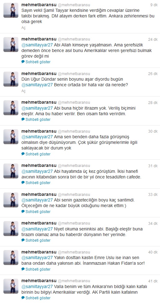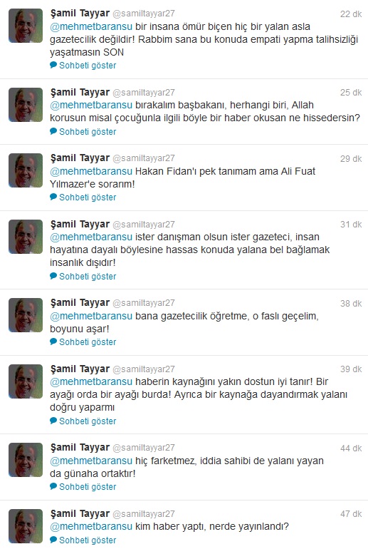 Baransu 'nun göndermeli tweetine aynı sertlikte karşılık veren Tayyar ise “Hiç farketmez, iddia sahibi de yalanı yayan da günaha ortaktır!” ifadelerini kullandı. “Haberin kaynağını yakın dostun iyi tanır! Bir ayağı orda bir ayağı burada! Ayrıca bir kaynağa dayandırmak yalanı doğru yapar mı?” diye soran Tayyar, söz gazeteciliği geldiğinde ise çılgına döndü. “Yalanı yayan sizin danışmanınız. Dünyanın her yerinde bu haberdir. İletişim fakültesinde gazetecilere bu öğretilir.” diye yazan Baransu 'yu topa tutan Tayyar, “Bana gazetecilik öğretme, o faslı geçelim, boyunu aşar!”, “İster danışman olsun ister gazeteci, insan hayatına dayalı böylesine hassas konuda yalana bel bağlamak insanlık dışıdır!” ifadelerini kullandı. Baransu, bu yazılanlara ise 'Abi senin gazeteciliğin boyu kaç santimdi. Ölçeceğim de ne kadar büyük olduğunu merak ettim:)' karşılığını verdi.