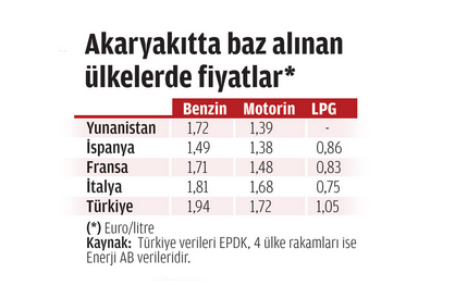 Geçen hafta yapılan zamla 5 liraya çıkan 1 litre benzinin fiyatı, son indirimle birlikte 4,85 liraya (1,94 Euro) geriledi. Ancak fiyatlar, Avrupa Birliği ülkeleri ortalaması olan 1,52 Euro 'nun çok üzerinde. İstasyonlarda 1 litre benzin 1,94 Euro 'dan, motorin 1,72 Euro 'dan, LPG (otogaz) ise 1 Euro 'dan satılıyor. Sektör temsilcilerine göre ise pahalı akaryakıtın en önemli sebebi yüksek vergi. EPDK, Haziran 2009 'da hızlı yükseliş üzerine fiyatları incelemeye almış ve dağıtım şirketlerini uyarmıştı.