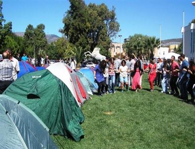 Ege Üniversitesi Merkez Kütüphanesi önünde yaklaşık 20 çadır kuran bir grup öğrenci, müzik eşliğinde halay çekip hem eğlendi hem de eylem yaptı.