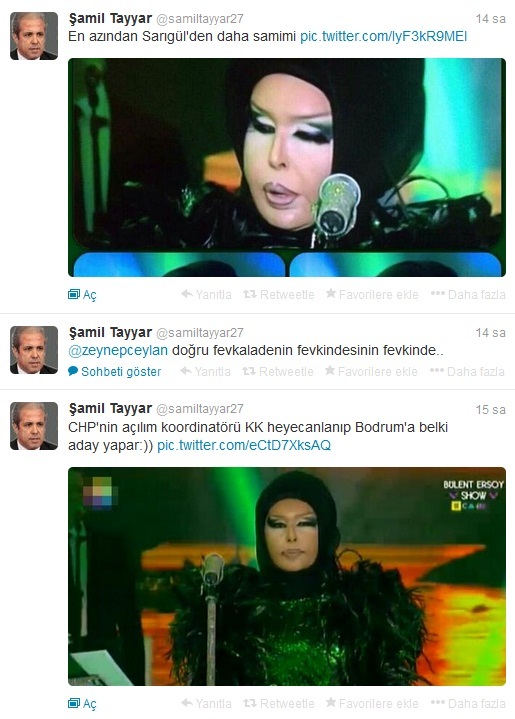 “CHP'nin açılım koordinatörü KK heyecanlanıp Bodrum'a belki aday yapar:))” diyerek Bülent Ersoy'un türbanlı fotoğrafını paylaşan Tayyar, “En azından Sarıgül'den daha samimi” diye ekledi.