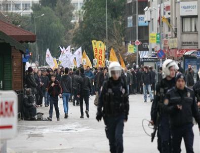 Polisin TOMA’larla önlem alması üzerine protestocularla polis arasında kısa süreli bir arbede yaşandı. Polis daha sonra grubun Basmane Meydanı’na yürümesine izin verdi. Teröristbaşı Abdullah Öcalan posterleri taşıyan ve sloganlar atan grup, Kültür Park Fuar Alanı Basmane Kapısı önünde toplanarak basın açıklaması yaptı. Basın açıklaması sonrası grup olaysız bir şekilde dağıldı.