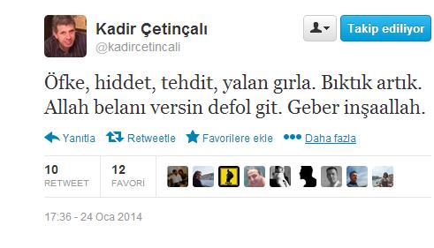 Kadir Çetindalı daha sonradan sildiği tweetinde, "Öfke, hiddet, tehdit, yalan gırla. Bıktık artık. Allah belanı versin defol git. Geber inşallah" yazmıştı.
