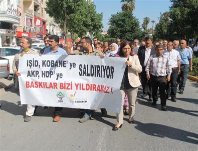 Öğle saatlerinde Özgür Çocuk Parkı içinde bir araya gelen HDP üyeleri, yolun karşısında bulunan il başkanlığı önüne kadar sloganlar atarak yürüdü. Polisin yoğun güvenlik önlemi aldığı eylemde, Burhan Felek Caddesi bir süreliğine araç trafiğine kapatıldı. Partililere Akdeniz Belediye Eş Başkanı Yüksel Mutlu da destek verdi. Burada grup adına açıklama yapan HDP Eş Başkanı Sevgi Aktaş, Kobani'de bir halkın direnişi olduğunu ifade ederek, "Dün Suriye ve Irak'ta halklara karşı yapılan katliam ve soykırım bugün Kobani'de yapılıyor ve bütün dünya ağır silahlar, tanklar, toplar eşliğinde yapılan katliamı seyrediyor. IŞİD'e karşı halkların verdiği mücadele bir insanlık mücadelesidir. Barışı, bölgede yaşayan tüm halkların özgürlükleri savunma mücadelesidir. HDP Kobani'de yaşanan insanlık dramına taraftır, eli kanlı IŞİD çetelerine karşı direnen Kobani halkının yanındadır, yanında olmaya da devam edecektir. Zulmün olduğu yerde sessiz kalmak zulme taraf ve ortak olmaktır" dedi.