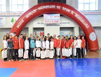 Amatör Spor Haftası kapsamında düzenlenen, bilardo, masa tenisi, taekwondo, streetball ve ayak tenisi turnuvalarında dereceye giren sporculara madalya ve kupaları takdim edildi. Ardından amatör spor kulüplerine malzeme yardımı yapıldı. Düzce ASKF Başkanı Erdoğan Bıyık, hafta boyunca yoğun çalışan Gençlik Hizmetleri ve Spor İl Müdürlüğü antrenörlerine teşekkür ederek hediye takdim etti.