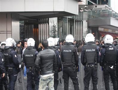 Otelin önünde slogan atan grup üyeleri, daha sonra polisin uyarılarına rağmen yürüyüşe geçti. Dağılmayan gruba çevik kuvvet polisi önce kalkanlarla müdahale etti. Grup yürümeye devam edince bu kez biber gazı kullanıldı