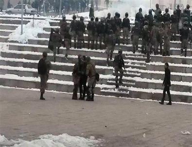 Jandarma ekipleriyle bir süre tartışan HDP'liler adına konuşan Asrın Hukuk Bürosu Avukatı Mensur Işık, 2012 yılında Roboski'de katliam yapıldığını ve buna dikkat çekmek için öğrencilerin basın açıklaması yaptıklarını ve sert müdahaleyle karşılaştıklarını söyledi.