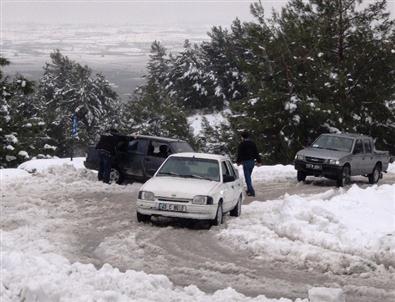 Araçlarıyla dağa çıkan vatandaşlar kaygan zeminde zor anlar yaşarken, Şehzadeler Belediyesine ait bir kepçe ve greyder sürekli yol açma çalışmasını yürütüyor. Dün başlayan kar yağışının ardından beyaza bürünen Spil Dağı Milli Parkı