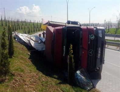 Kocaeli'nin Kartepe ilçesi Suadiye köprülü kavşağında meydana gelen trafik kazasında virajı alamayan sunta yüklü TIR devrildi.