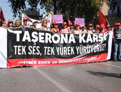 İzmir Basmane Meydanı’nda toplanan DİSK, KESK, TÜRK-İŞ VE TMMOB üyeleri, Soma’da meydana gelen kazada ölen 301 işçiyi anmak ve taşeronlaşmaya ‘hayır’ demek için yürüdü.