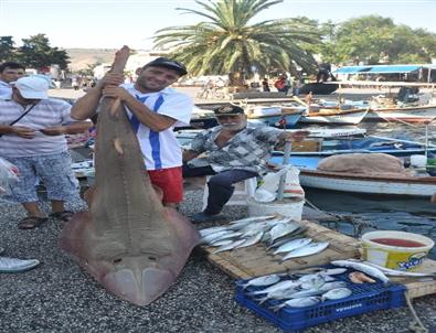 Dün akşam saatlerinde 'Efecan' isimli teknesiyle Foça’dan denize açılan Şahner Eser’in denize bıraktığı ağlarına çipura, levrek ve karagözlerin yanı sıra dev bir kemane balığı takıldı. Şahner reis, dev balığın takıldığı ağlarını teknesine güçlükle çekti. Foçalı balıkçı Şahner Eser, dev balığı Foça’nın küçük deniz limanına getirdi. Dev balığı görenler uzun süre inceledikten sonra cep telefonu kameraları ile görüntüledi. Dev balık satılmak üzere