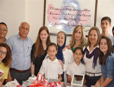 Rabia ve Şeyma’ya tablet bilgisayarları Hasan Türek Anadolu Lisesi Onur Kurulu Başkanı Nükhet Belge tarafından takdim edildi.