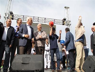 Konuşmaların ardından Vali Mustafa Hakan Güvençer, Büyükşehir Belediye Başkanı Osman Gürün ve Rıdvan Dilmen, statta toplanan binlerce çocuğa voleybol, basketbol ve futbol topu dağıttı.