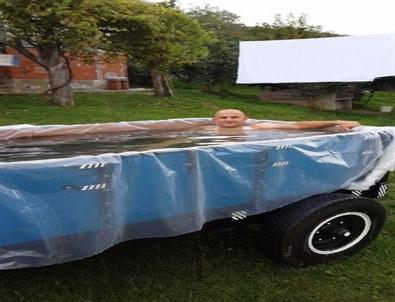 Akçakoca’da Kazım Tandoğan isimli vatandaş, sıcaktan bunalınca traktör römorkunu havuza çevirdi.