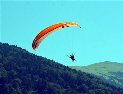 Trabzon’un Çaykara ilçesine bağlı doğal güzellikleri ile dünyaca ünlü Uzungöl'e gelen yerli ve yabancı turistler tepelere çıkarak yamaç paraşütü yapıyor.