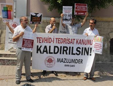 Adana'da İnsan Hakları ve Mazlumlar İçin Dayanışma Derneği (MAZLUM-DER) üyesi bir grup, Tevhid-i Tedrisat Kanunu'nun kaldırılması için basın açıklaması yaptı.