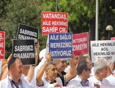 Adana'da doktorlar, Aile Hekimlikleri'nde ayda 8 saat nöbet tutulması zorunluluğuna tepki göstererek eylem yaptı.