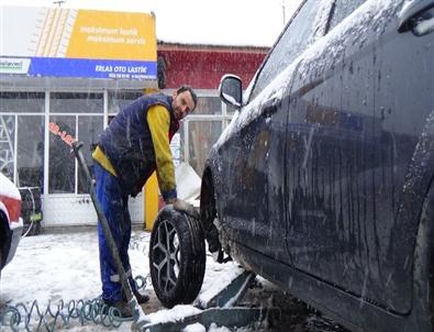 Erzincan’da Kar Yağışıyla Araç Sürücüleri Lastikcilere Akın Etti