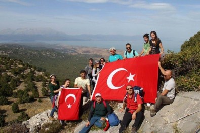 Konya’nın Beyşehir ilçesinde, doğaseverler doğa yürüyüşü etkinliğinde terör olaylarına tepki göstermek amacıyla omuzlarına astıkları Türk bayrakları ile bin 700 metrelik rakıma sahip Karakaya Dağının zirvesine tırmandı.