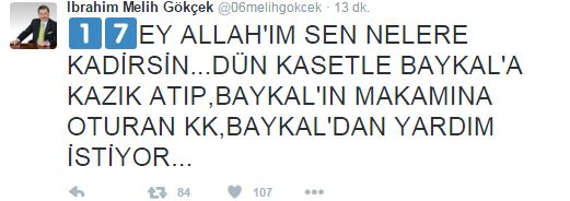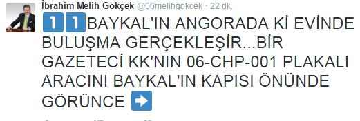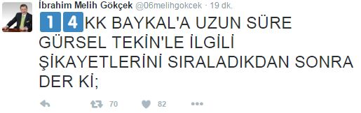 Kemal Kılıçdaroğlu'nun Gürsel Tekin'den rahatsızlık duyduğunu belirten Gökçek, Deniz Baykal ve Kılıçdaroğlu'nun bu konuyu görüşmek üzere Baykal'ın Angora'daki evinde biraraya geldiklerini açıkladı.