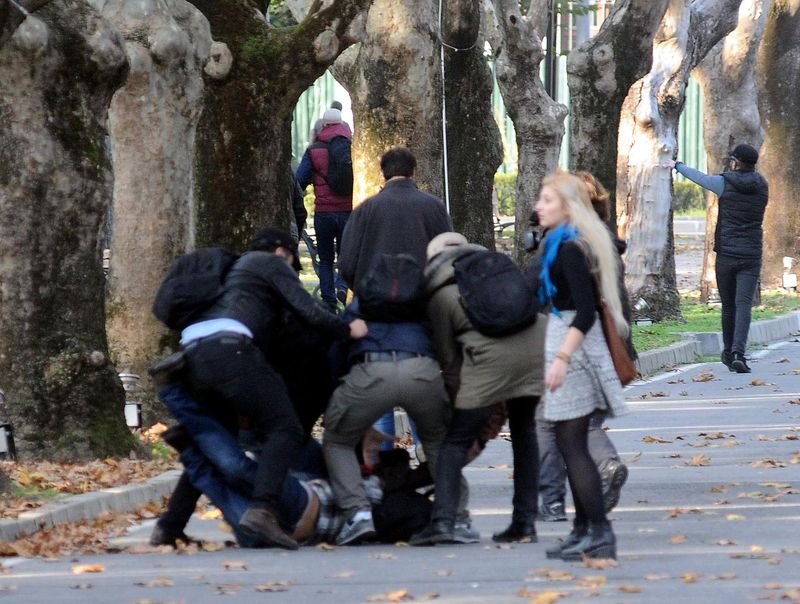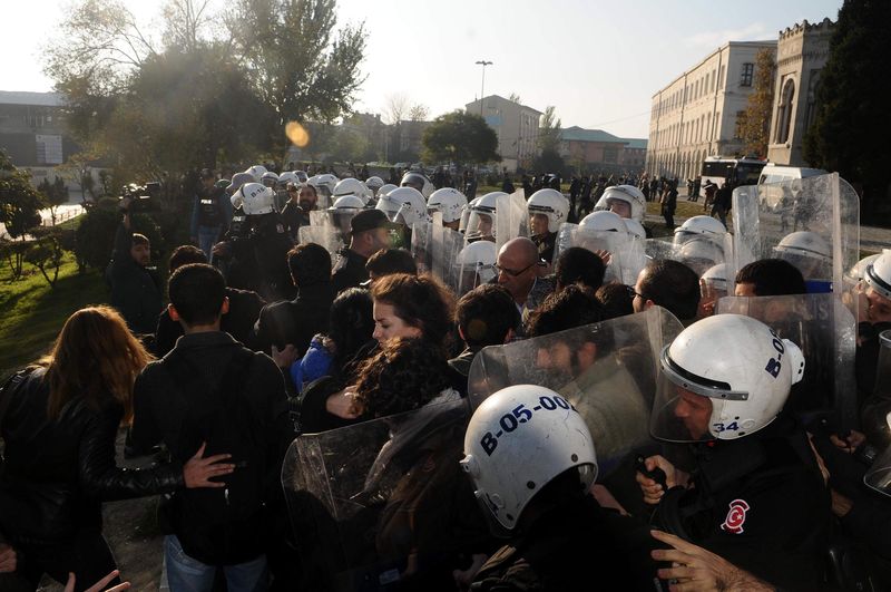 Taş ve şişe atan kampüs içindeki gruba polis müdahale etti. Polis, kampüse girmek isteyen gruba da kalkanlarla müdahale etti.