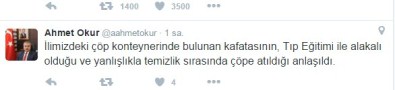 twitter hesabından olayın sırrını anlatan şu tweti paylaştı; “İlimizdeki çöp konteynerinde bulunan kafatasının,