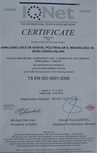 Aile ve Sosyal Politikalar Kırklareli İl Müdürlüğü’nün hizmet kalitesi Türk Standartları Enstitüsü tarafından onaylanarak belgelendirildi.