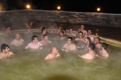 Öte yandan Lalezar Termaldeki şifalı suların keyfini çıkaran gazeteciler, sıfırın altına kadar düşen hava sıcaklığına rağmen terasta konuşlandırılan açık hava havuzunun da tadını çıkardılar.