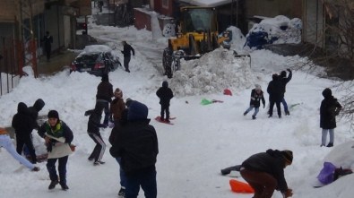 naylon poşet, kaygan ayakkabı ve kızaklarla kayarak doyasıya eğlendiler. Düşe kalka kayan çocuklar, yol açmaya gelen bir iş makinesine ise aldırış etmediler. İş makinesinin önünde kaymaya devam eden çocuklar, yolun açılmasına tepki göstererek iş makinesini kartopu yağmuruna tuttular.