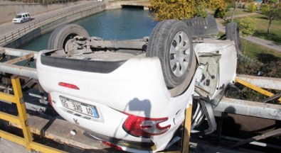 Adana’da virajı alırken demir korkuluklara çarpan otomobil köprüden sulama kanalına düşmeye ramak kala durabildi.