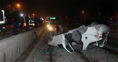 Tramvay Hattına Uçan Otomobilde Sıkıştı