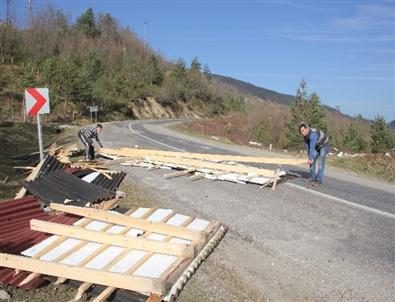 Daha sonra, yola uçan çatı ise vatandaş tarafından yoldan kaldırıldı.