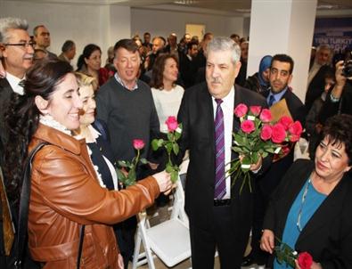 Atila konuşmasının ardından toplantıyı takip edenlere eşiyle birlikte 14 Şubat sevgililer günü dolasıyla karanfil dağıttı.