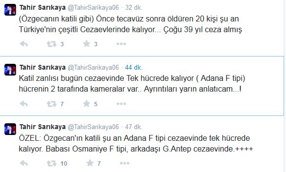 Tahir Sarıkaya, Özgecan'ın katilleri hakkında çok özel kulis bilgilerine ulaştı. Sarıkaya edindiği bilgileri sosyal medya hesabı Twitter'da takipçileriyle paylaştı.