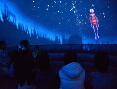 Normal görüntüleme sistemlerinden farklı özellikleri bulunan uzay çadırındaki projeksiyon ile yarım küre şeklindeki alana yansıtılan filmler izleyenlerde “uzaydaymış” hissini sağlıyor.